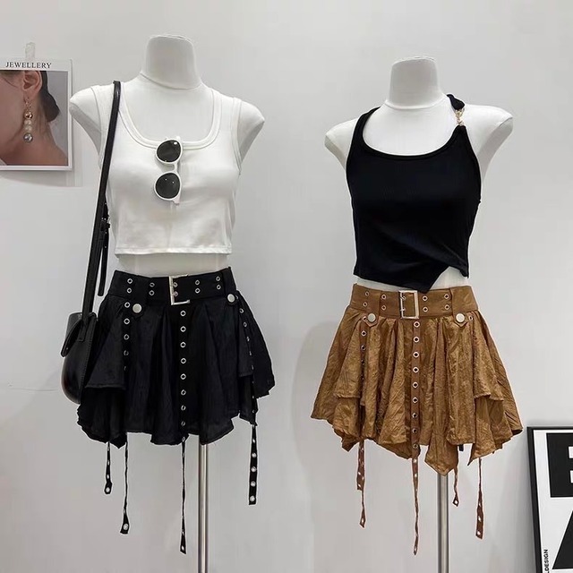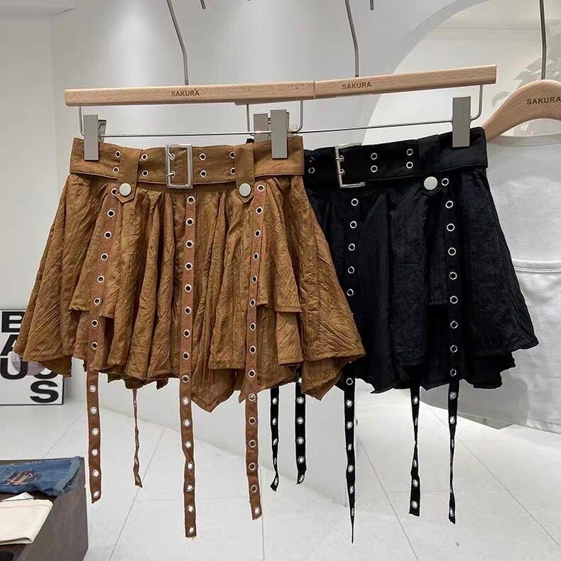 ウエストのアイレットベルトがポイントのカジュアルフレアスカート。