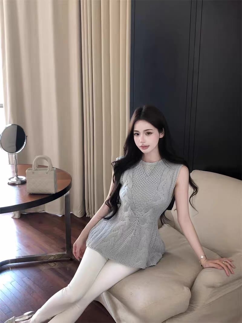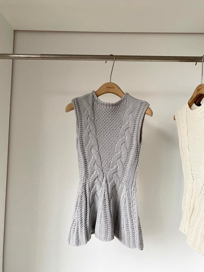 立体感のあるケーブル編みとふんわり広がるペプラムシルエットが魅力のノースリーブニットトップス。
