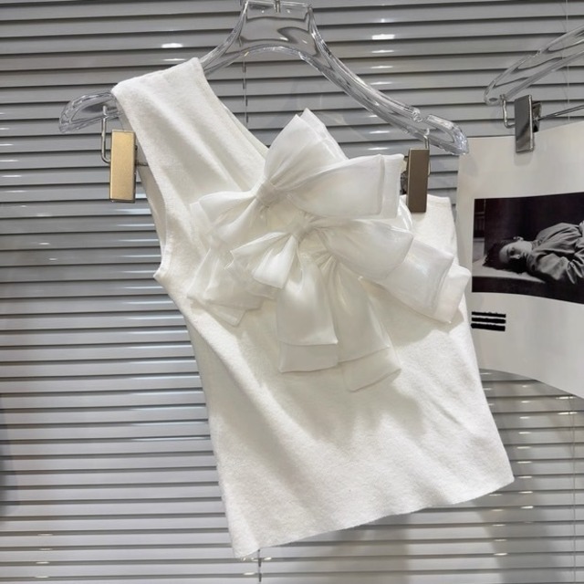 フェミニンムード漂うワンショルダーデザインに、トリプルリボンが華やかさをプラス。アシンメトリーなシルエットがトレンド感を演出し、コーデにアクセントを加えます。デニムやスカートと合わせて、甘辛ミックスなスタイルにもおすすめの一枚。