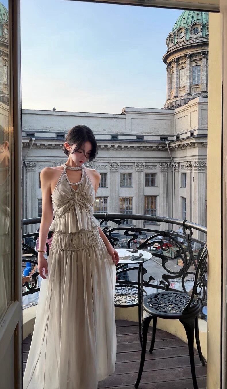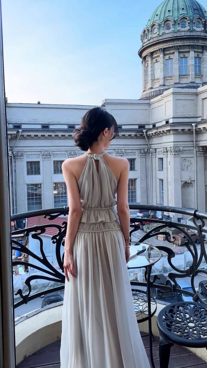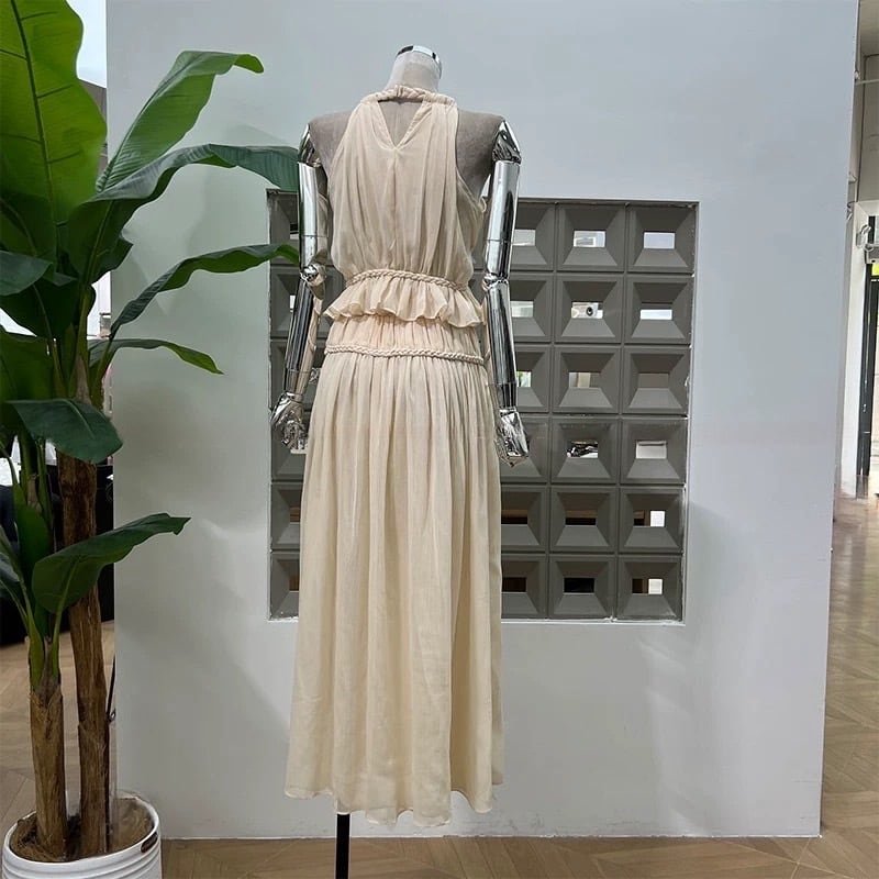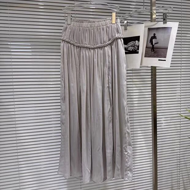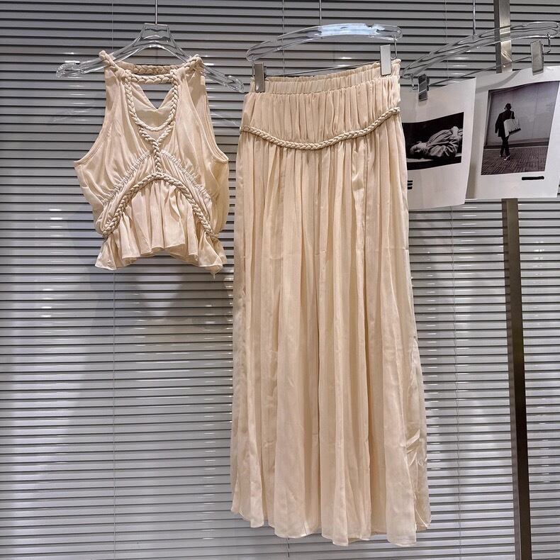 光沢感のあるサテン生地に編み込みストラップをあしらった、トップスとスカートのセットアップ。軽やかなプリーツスカートとフリルデザインのトップスがフェミニンな雰囲気を演出します。単品でもセットでも着こなし自在で、デイリーから特別なお出かけまで幅広く活躍するアイテムです。
