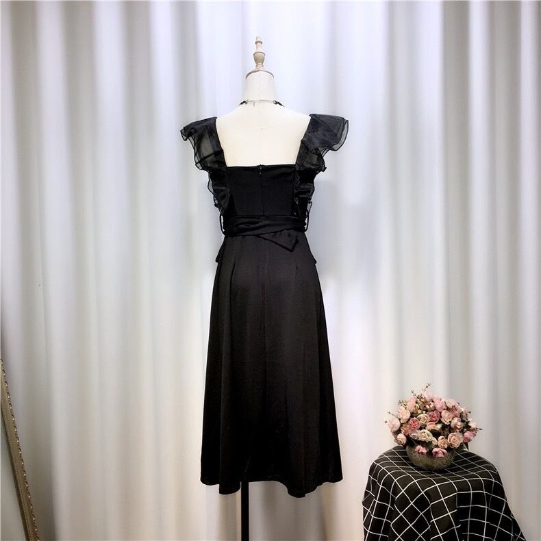 ブラックでエレガントな一着。フリルデザインのノースリーブは華やかな印象を与え、肩周りをスッキリと見せてくれます。ウエスト部分にはベルトが付いておりウエストラインを美しく引き締めてくれます。