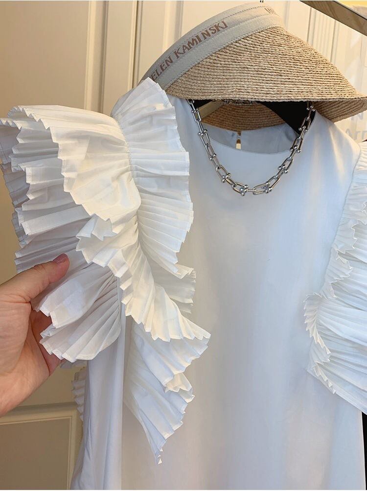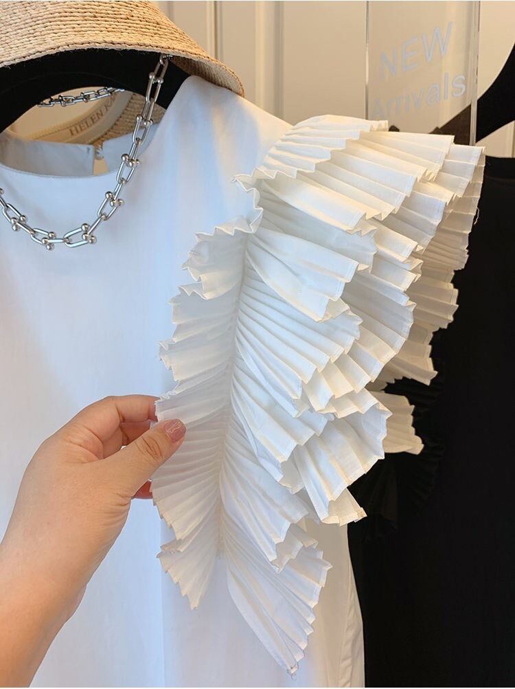 エレガントで上品な印象を与えるワンピース。肩部分にプリーツフリルが施されたシンプルなデザインが特徴の一着。