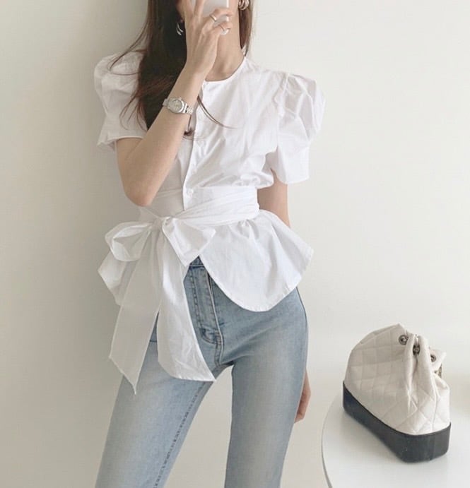 女性らしい魅力を引き立てるデザインのブラウスです。パフスリーブのディテールが特徴で、ふんわりとした袖が上品な印象を与えます。