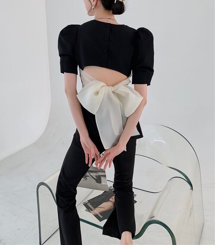 パフスリーブバックリボントップス