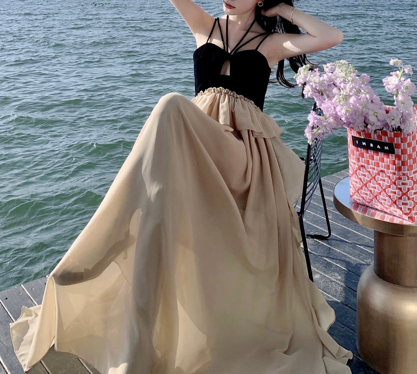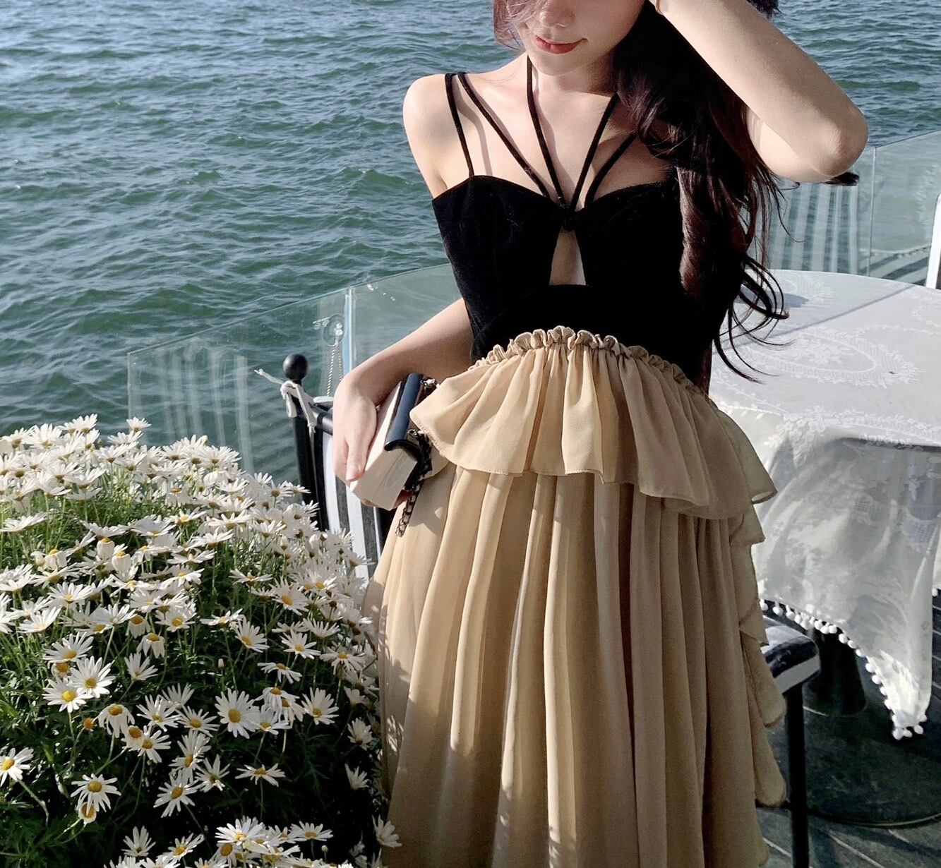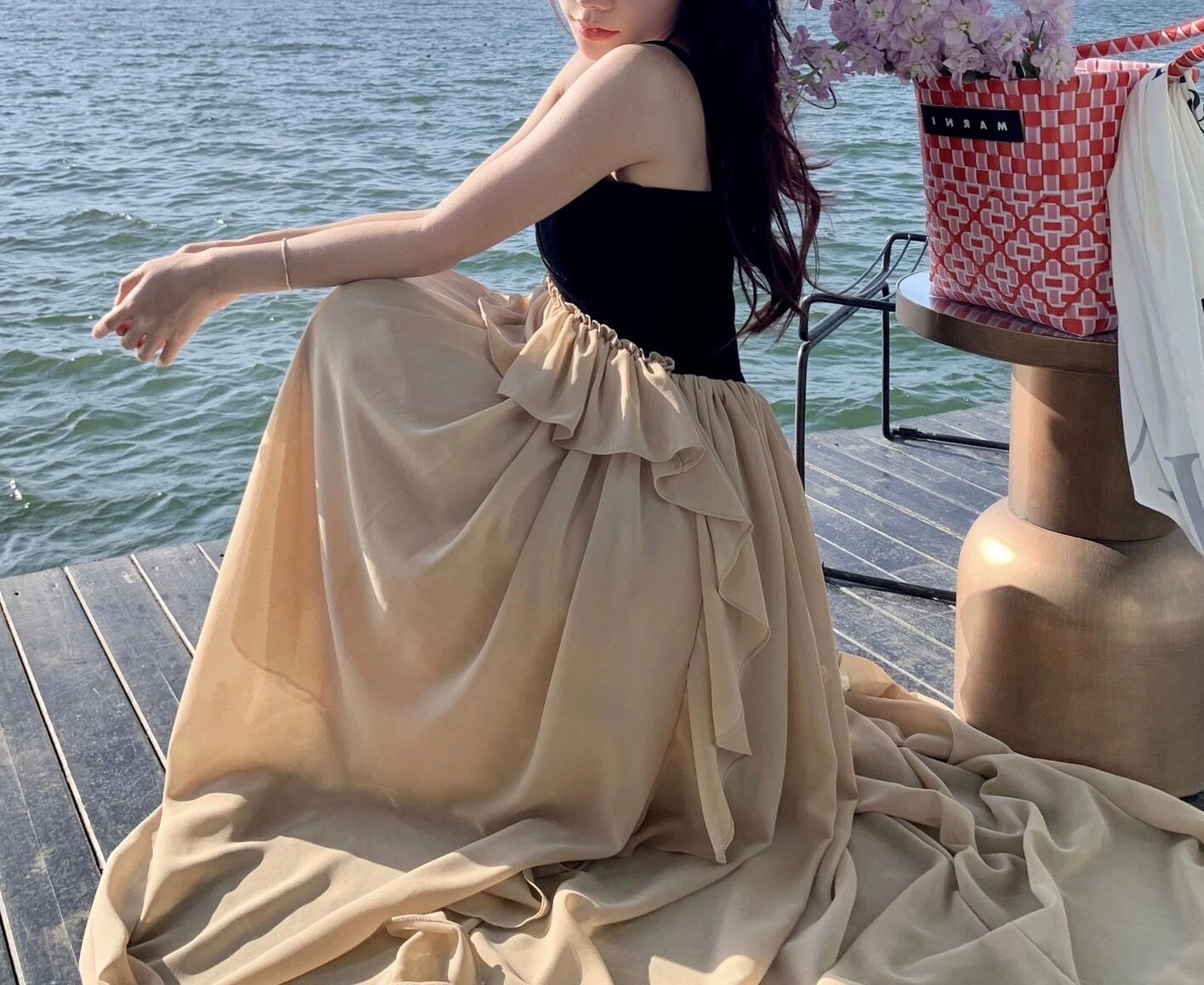 軽やかで女性らしいデザインのワンピースです。シフォン素材を使用しているため、柔らかな風合いと透け感が特徴です。キャミストラップが肩から細く伸びており、涼しげな印象を与えます。リゾートやビーチなどのカジュアルな場面で活躍し、暑い季節にぴったりのアイテムです。軽やかな着心地と涼しげなスタイリングで、リゾート気分を味わえるワンピースです。