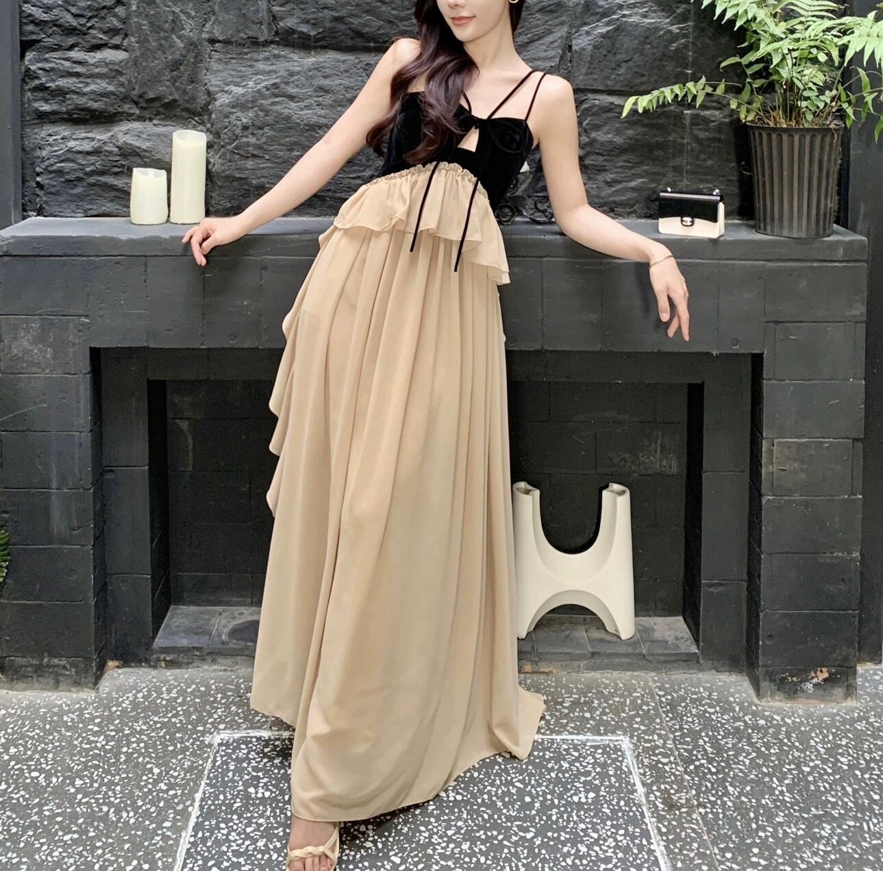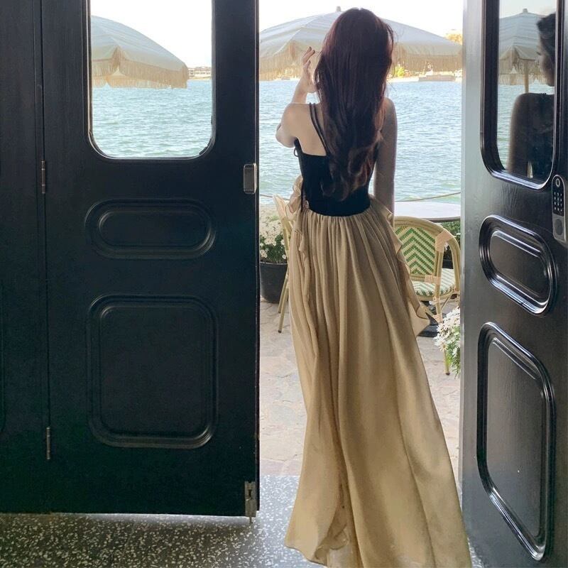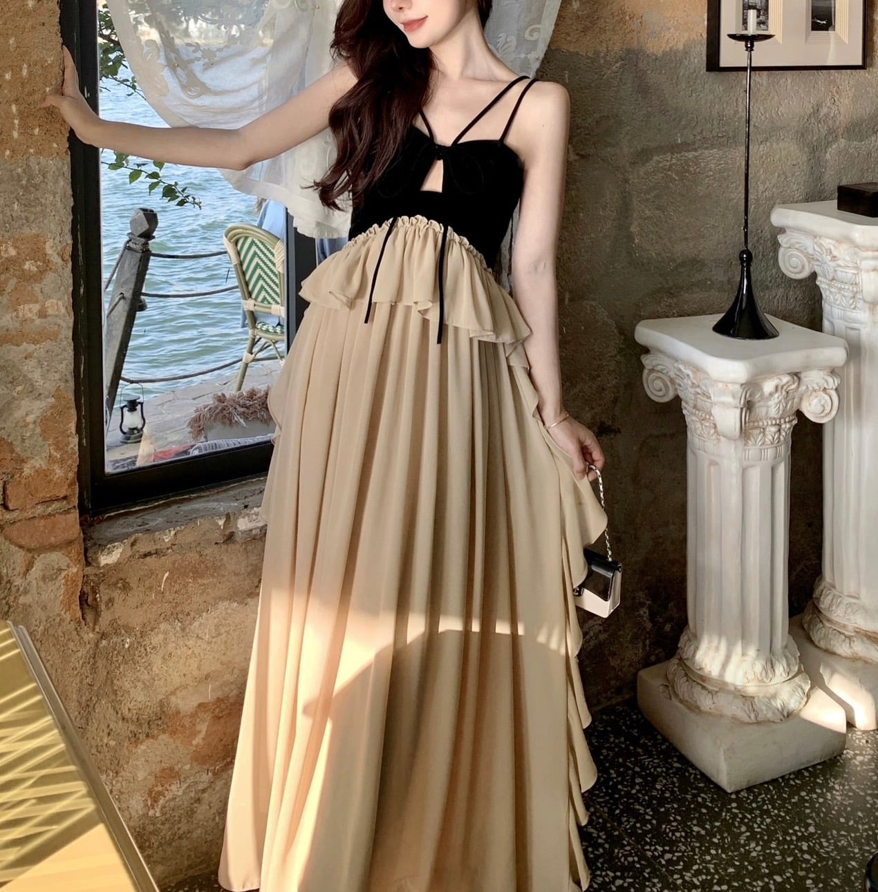 軽やかで女性らしいデザインのワンピースです。シフォン素材を使用しているため、柔らかな風合いと透け感が特徴です。キャミストラップが肩から細く伸びており、涼しげな印象を与えます。リゾートやビーチなどのカジュアルな場面で活躍し、暑い季節にぴったりのアイテムです。軽やかな着心地と涼しげなスタイリングで、リゾート気分を味わえるワンピースです。