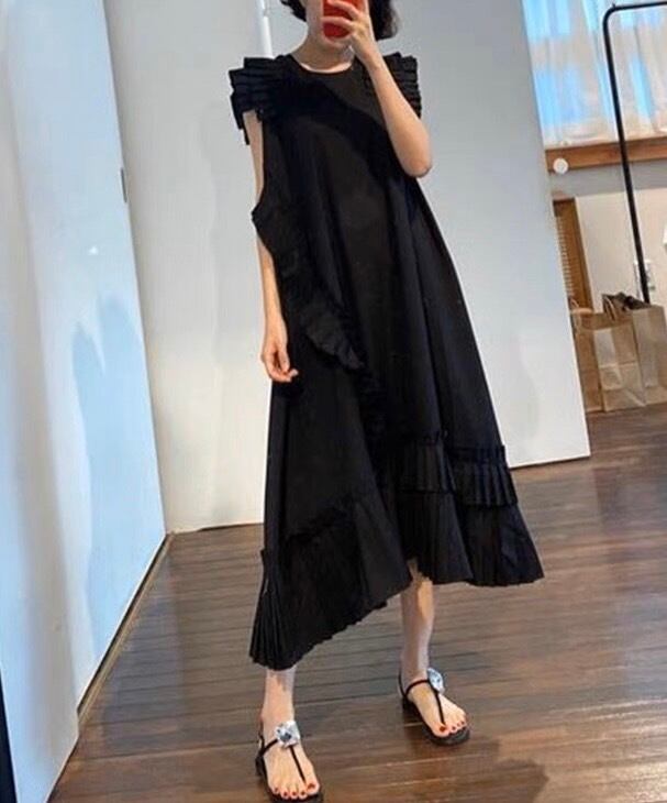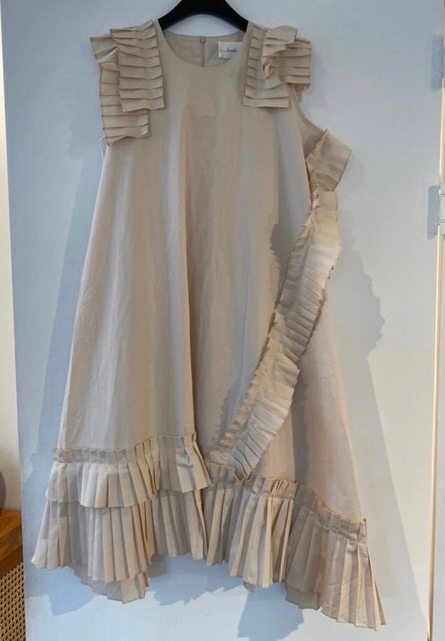 このワンピースは、プレスプリーツが施されたパネルが特徴的なデザインです。プレスプリーツによって、独特なボリューム感があります。