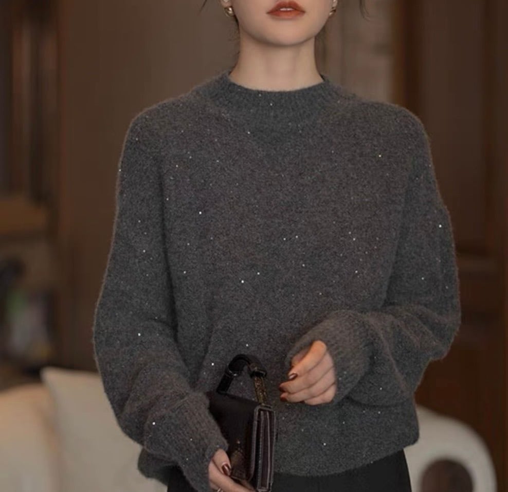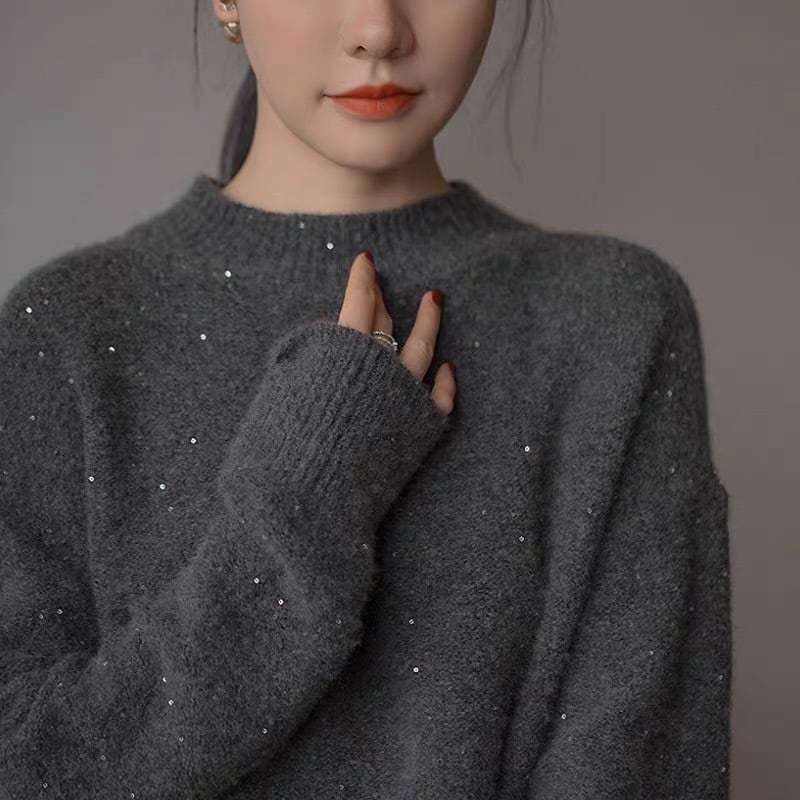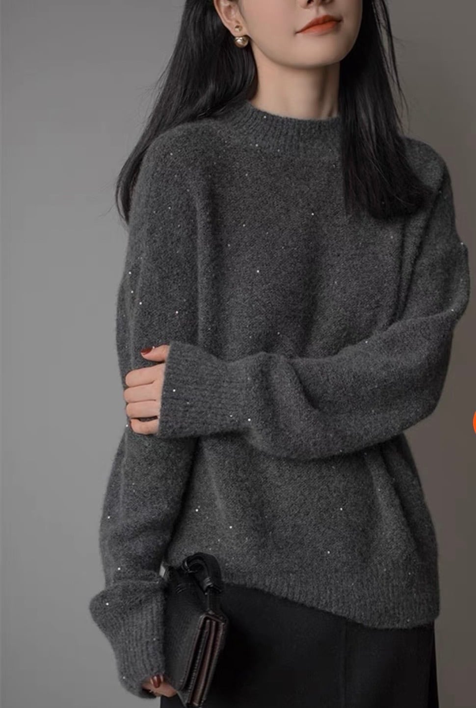 シンプルでありながら洗練されたスタイルを演出するファッションアイテムです。上品なグレーカラーのニットセーターに、スパンコールが施されており、光沢と輝きをプラスしています。
