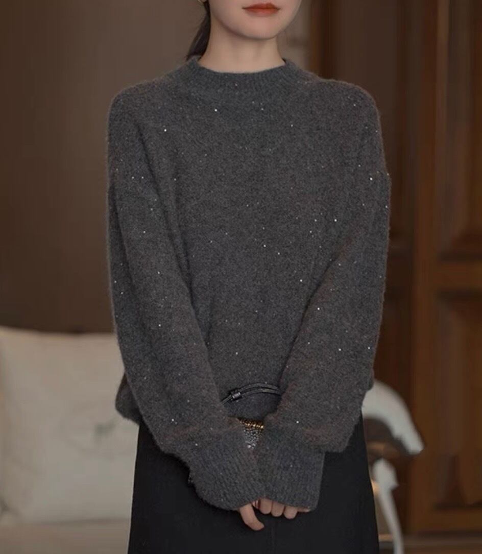このセーターは、柔らかな編み地と快適なフィット感を提供し、寒い季節にあたたかさをキープします。また、スパンコールのデザインが、セーターにエレガントで華やかな要素を加え、特別な日や夜のイベントにぴったりです。
