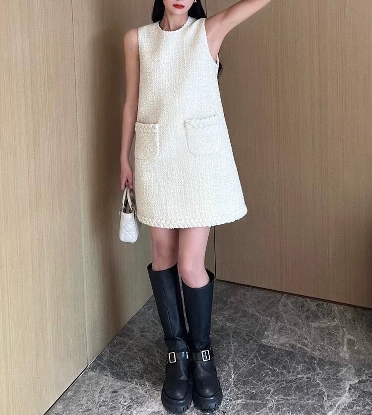 エレガントな雰囲気漂うツイードホワイトジャケットノースリーブワンピースセット。洗練されたデザインと上品な素材が、特別な日やフォーマルな場面で輝く一着です。