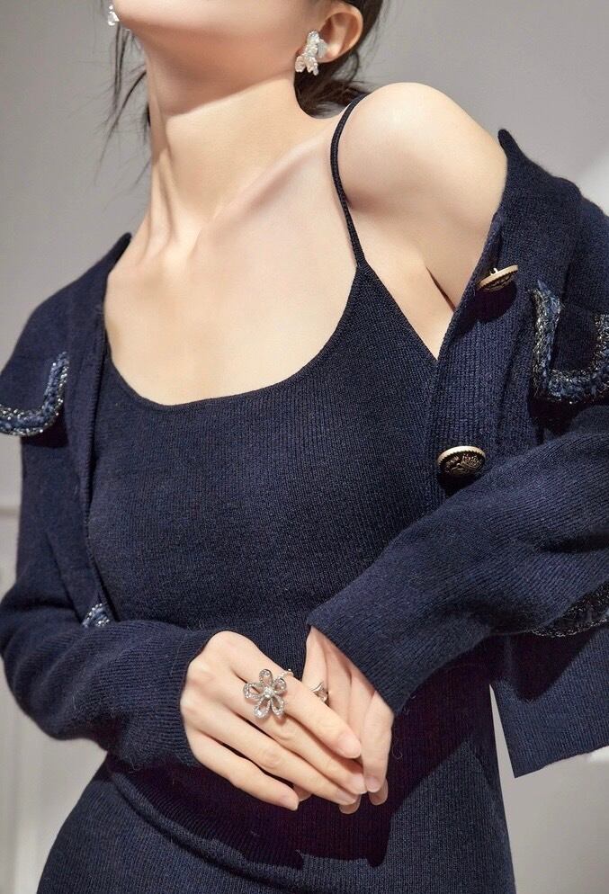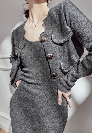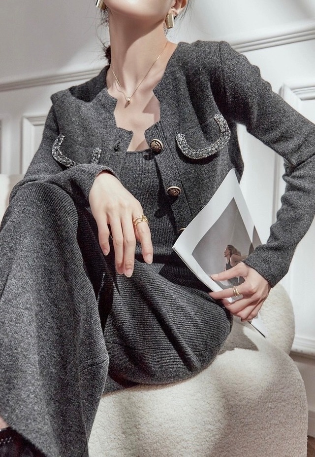優雅で女性らしい雰囲気を演出する、一石二鳥のアイテムです。上品なフレンチカーディガンと、すっきりとしたシルエットのストレートニットワンピースが組み合わさり、トレンディで洗練されたスタイルを提供します。