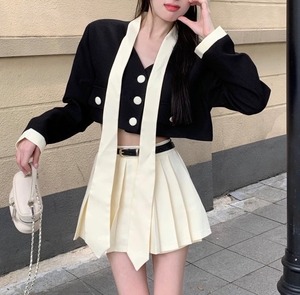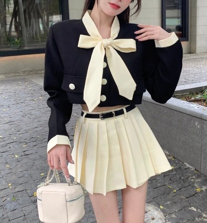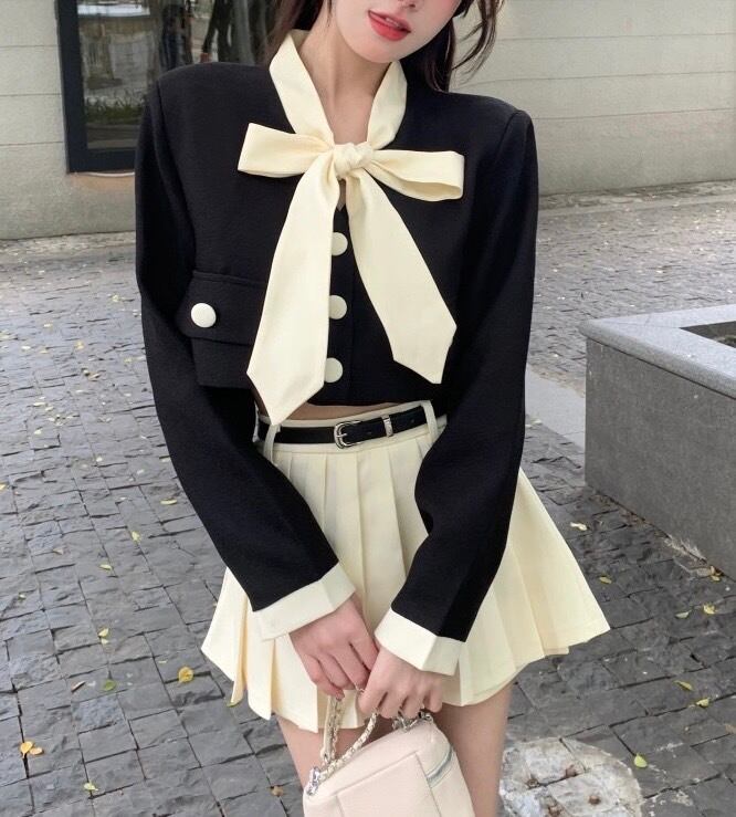 このボウタイカラーブロックフレアスカートセットアップは、スタイリッシュでフェミニンな印象を演出します。上品なボウタイデザインが首元を飾り、カラーブロックのディテールが華やかさをプラスします。フレアスカートは女性らしいシルエットを描き、動きやすさも兼ね備えています。イベント、デートなど、様々なシーンで活躍する一着です。