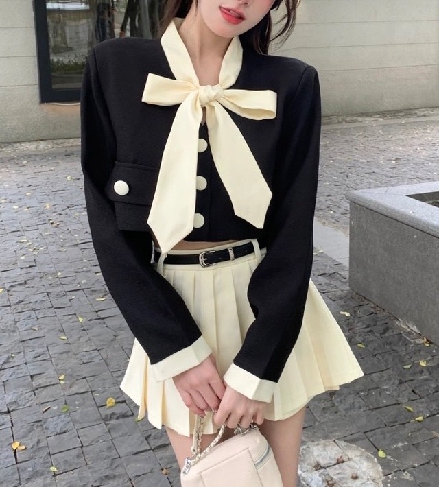 全2色ボウタイカラーブロックフレアスカートセットアップ
