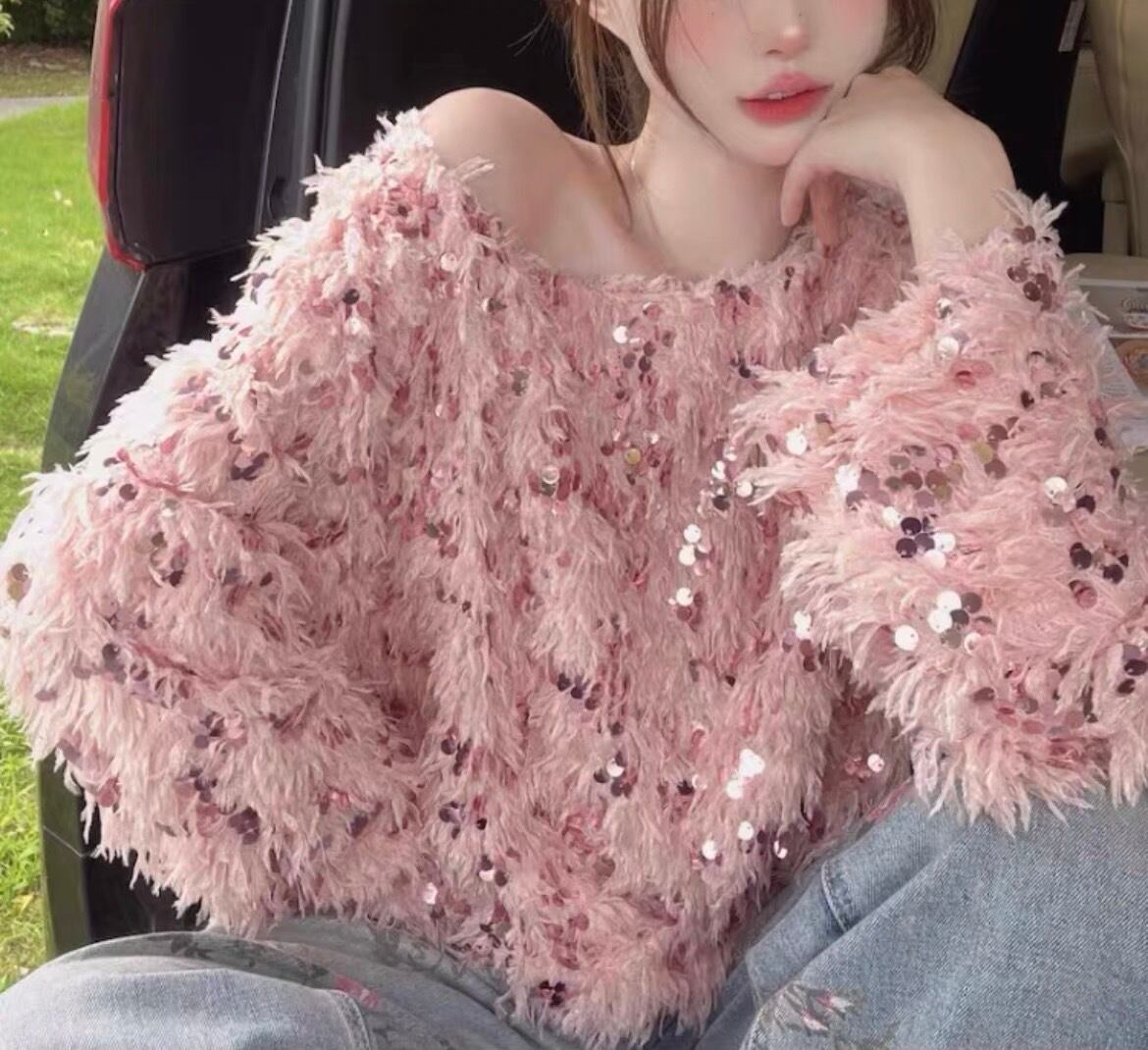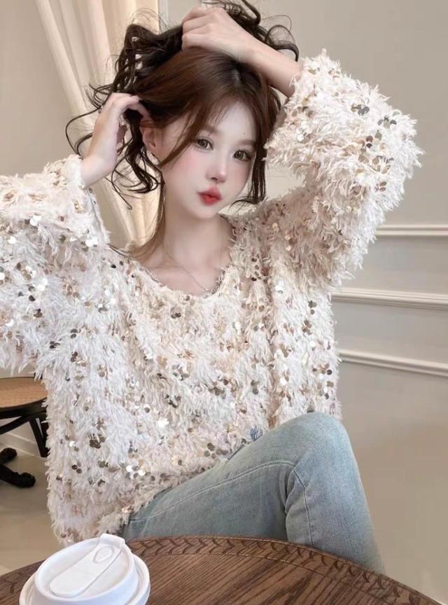 全2色スパンコールフリンジニット