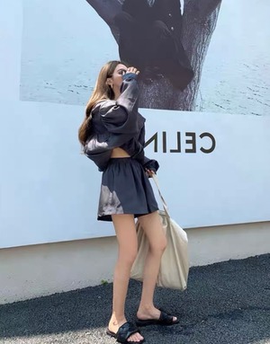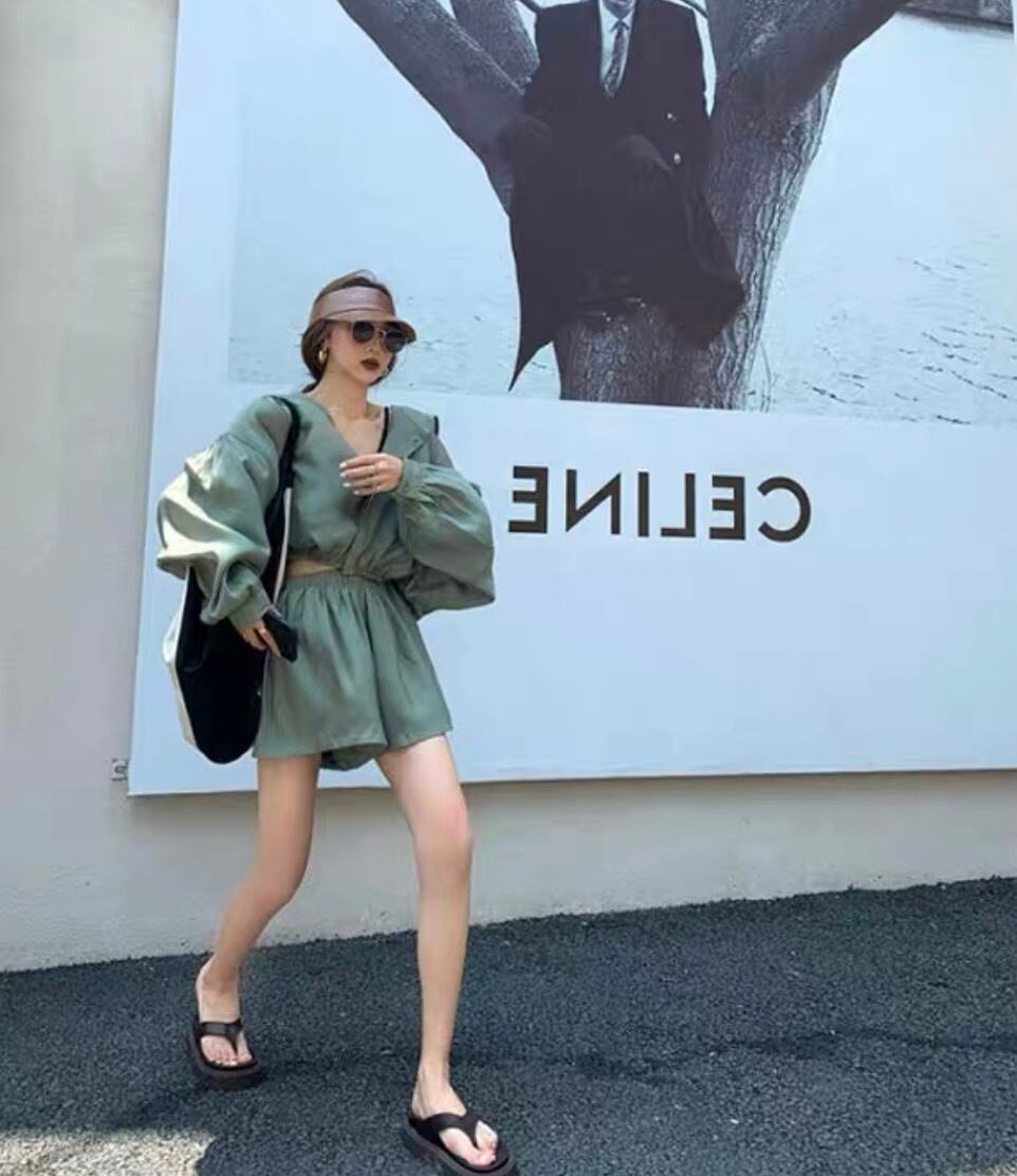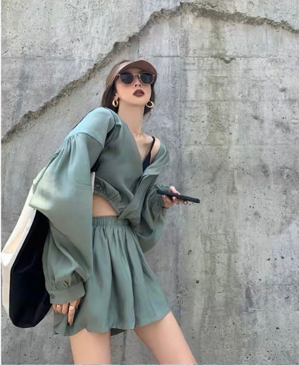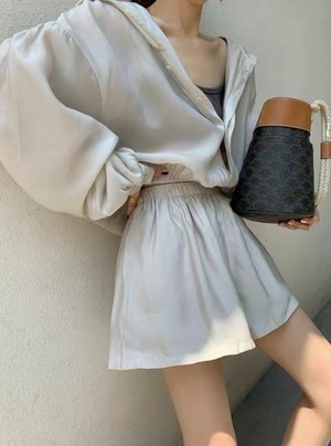 全3色シフォンフード付きシャツショートパンツセットアップ