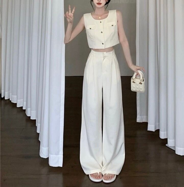 ツイードショートノースリーブトップスとワイドパンツのセットです。トップスは上品なツイード素材を使用し、ノースリーブデザインで涼しげかつエレガントな印象を与えます。ショート丈がスタイルをすっきりと見せ、ウエストラインを強調します。ワイドパンツはリラックスした履き心地でありながら、脚長効果も抜群です。セットで着ることで、統一感のある洗練されたコーディネートが完成します。