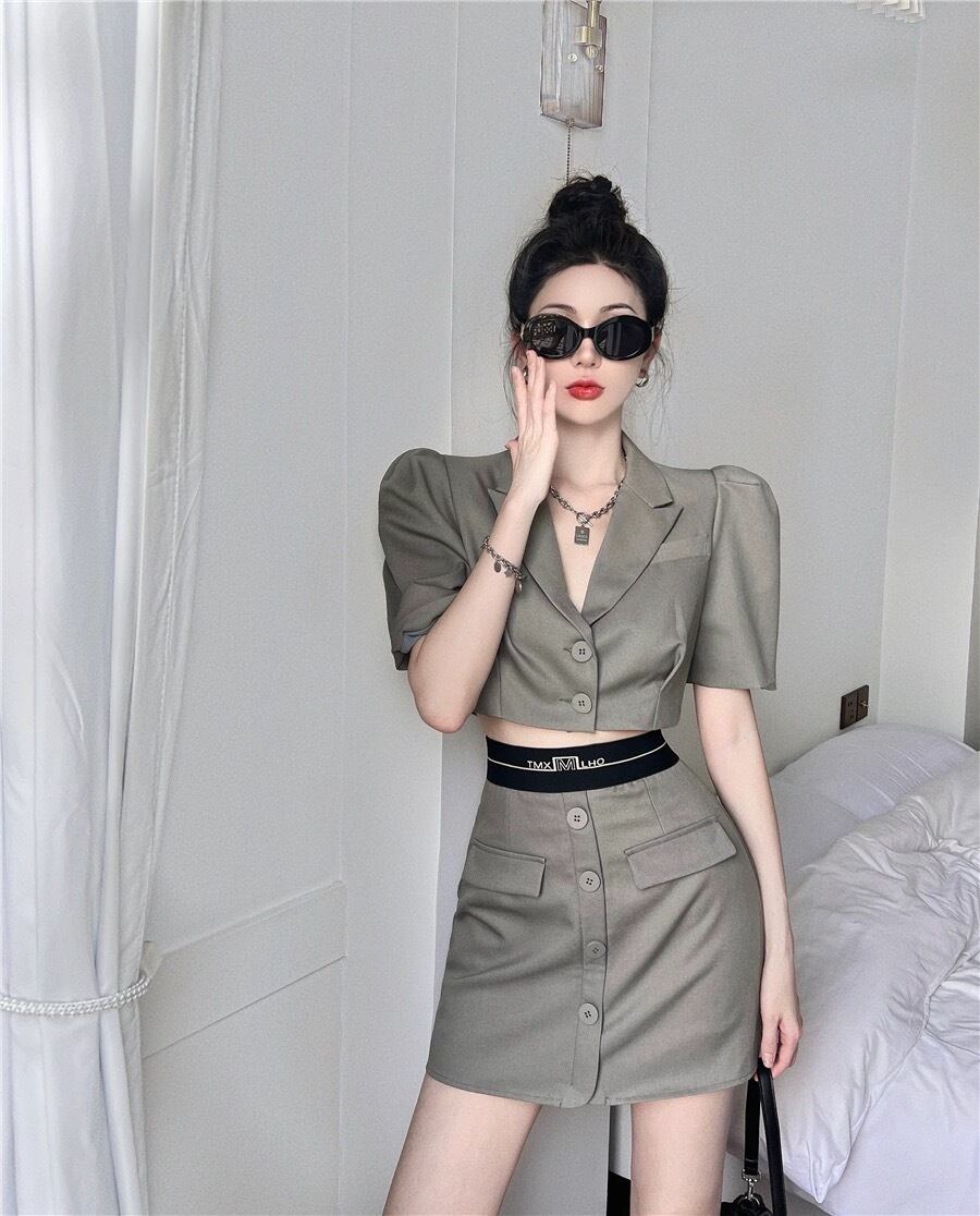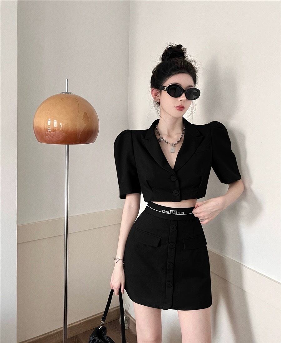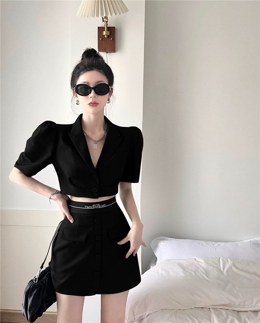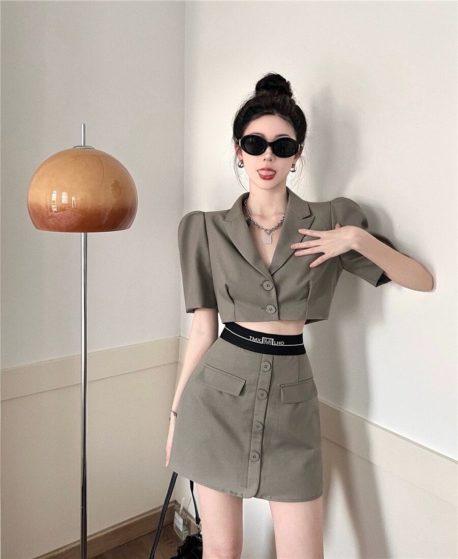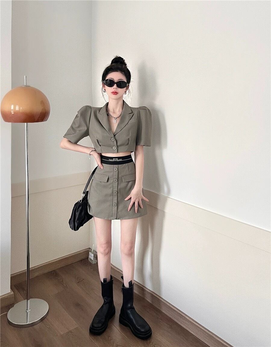 全2色カジュアルパフスリーブジャケット&ミニスカートスーツ