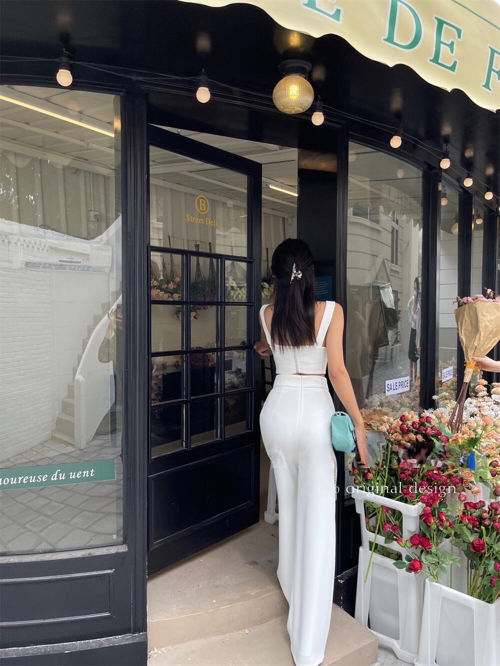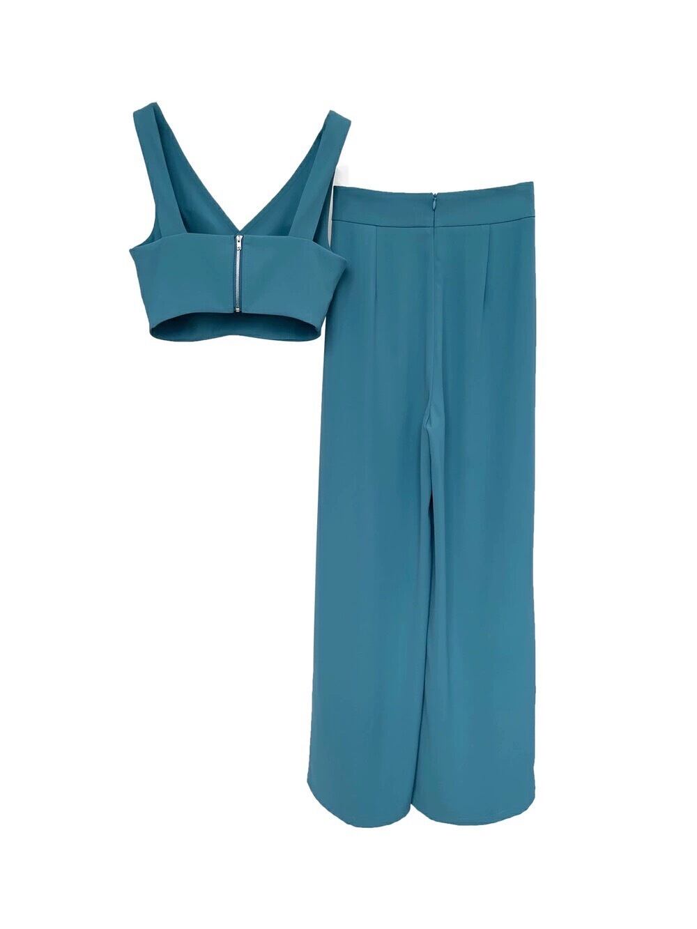 シンプルでスタイリッシュなセットアップ。Vネックのクロップドトップとハイウエストのワイドパンツが、洗練されたシルエットを演出します。軽やかな素材感が心地よく、カジュアルにもエレガントにも着こなせる万能アイテムです。デイリーコーデやお出かけにぴったりの一着です。