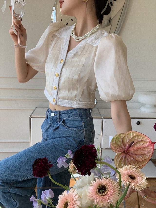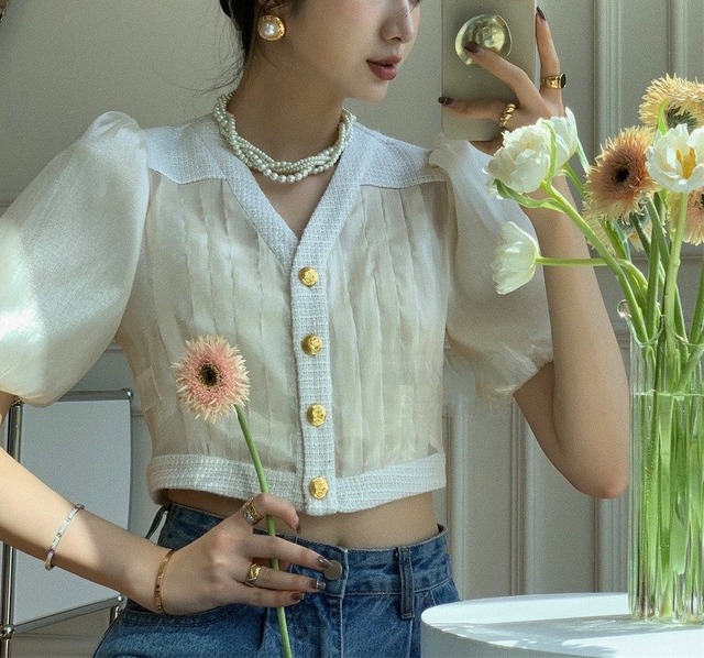 ゴールドボタンパフシフォンブラウス