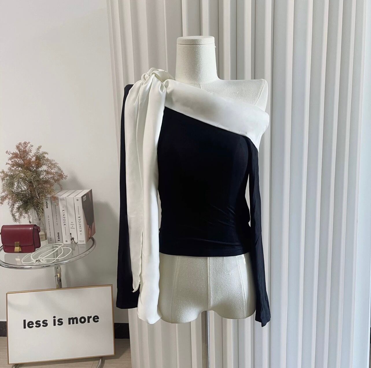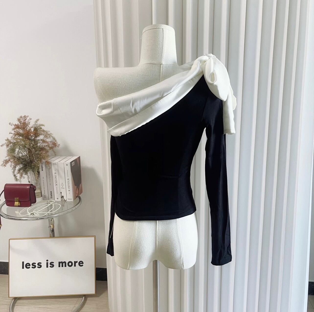 スタイリッシュでモダンなデザインが特徴のリボンワンショルダー長袖トップスです。片肩にあしらわれたリボンがアクセントとなり、エレガントで女性らしい印象を与えます。長袖デザインで、季節を問わずに着用可能。フィット感のあるシルエットが美しいラインを引き立て、デイリーから特別なシーンまで幅広く活躍します。