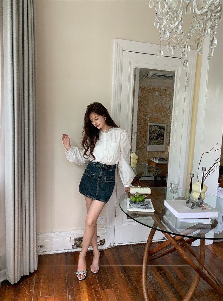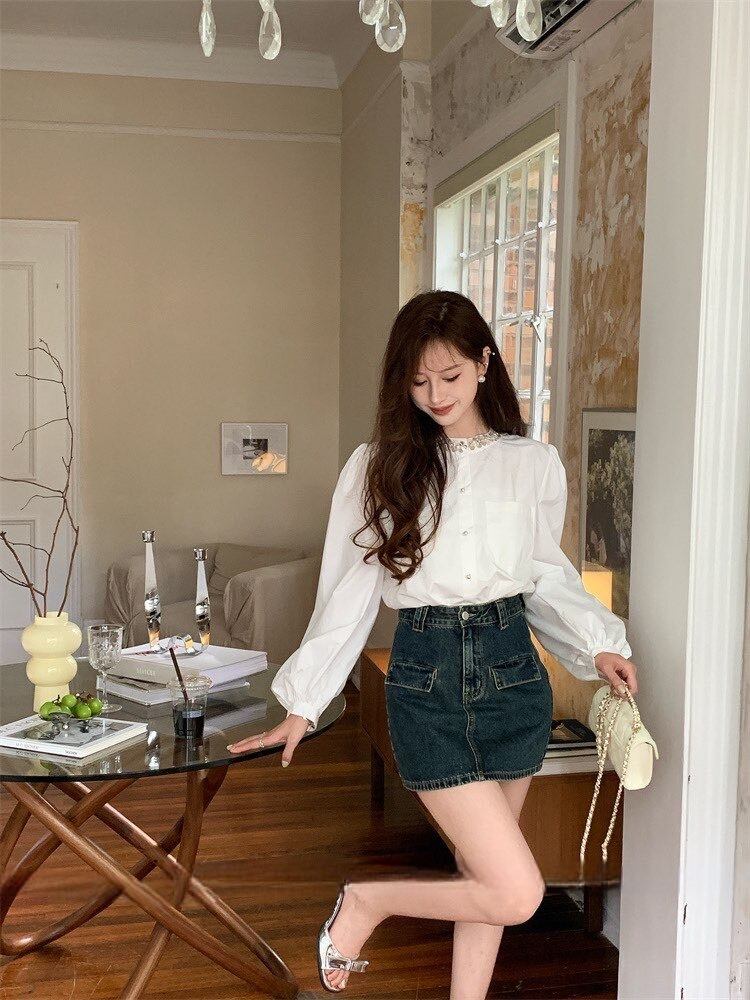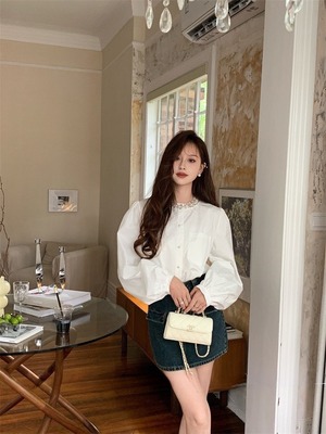 「ネックビジューパールシャツブラウス」は、ネックラインに施されたビジューとパールが上品さを引き立てる一枚。洗練されたデザインが女性らしさを演出し、フォーマルなシーンからオフィススタイルまで幅広く対応。シンプルながらも華やかさを添える、特別な日のためのブラウスです。