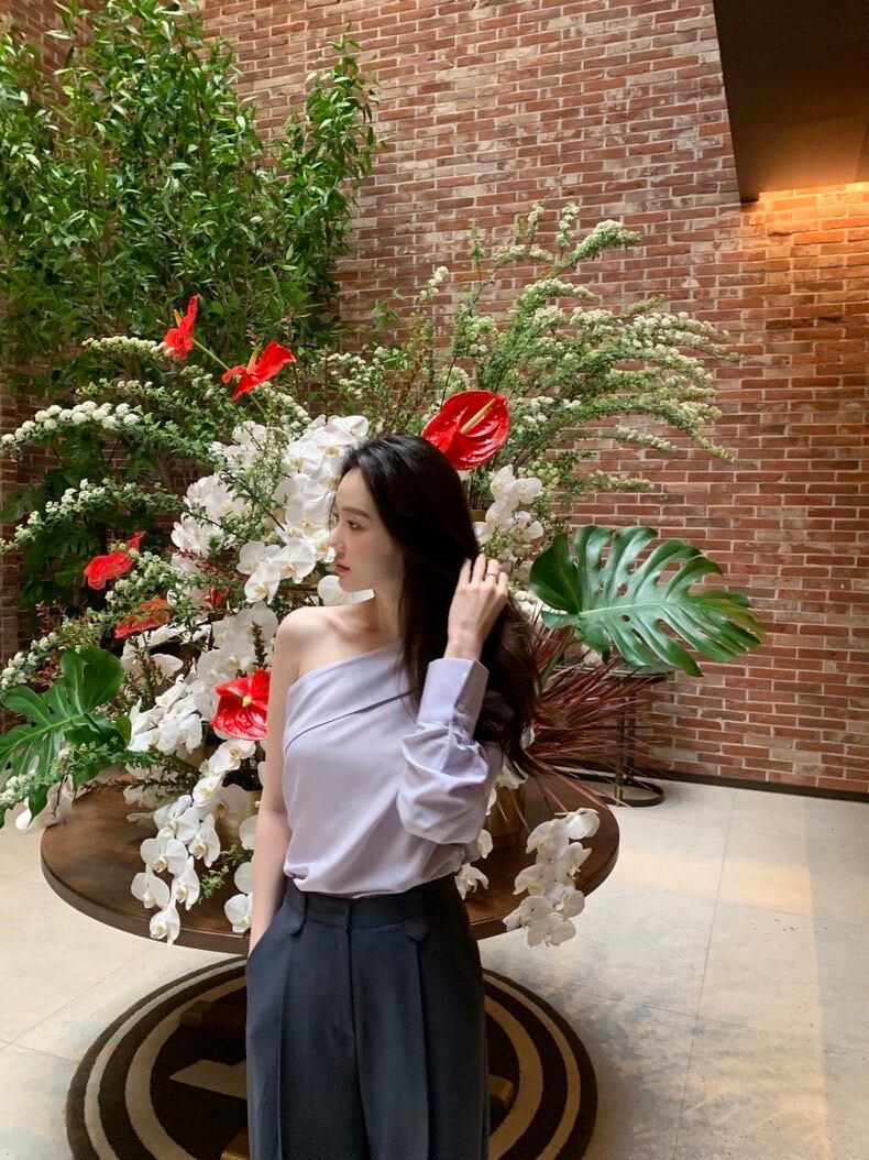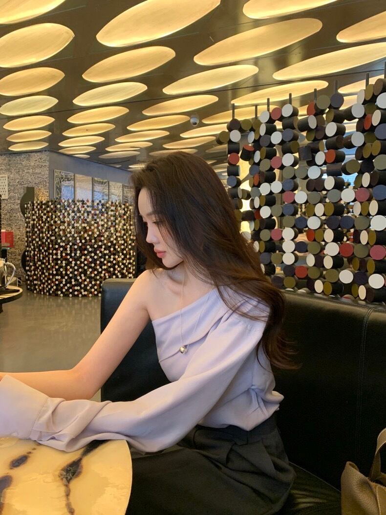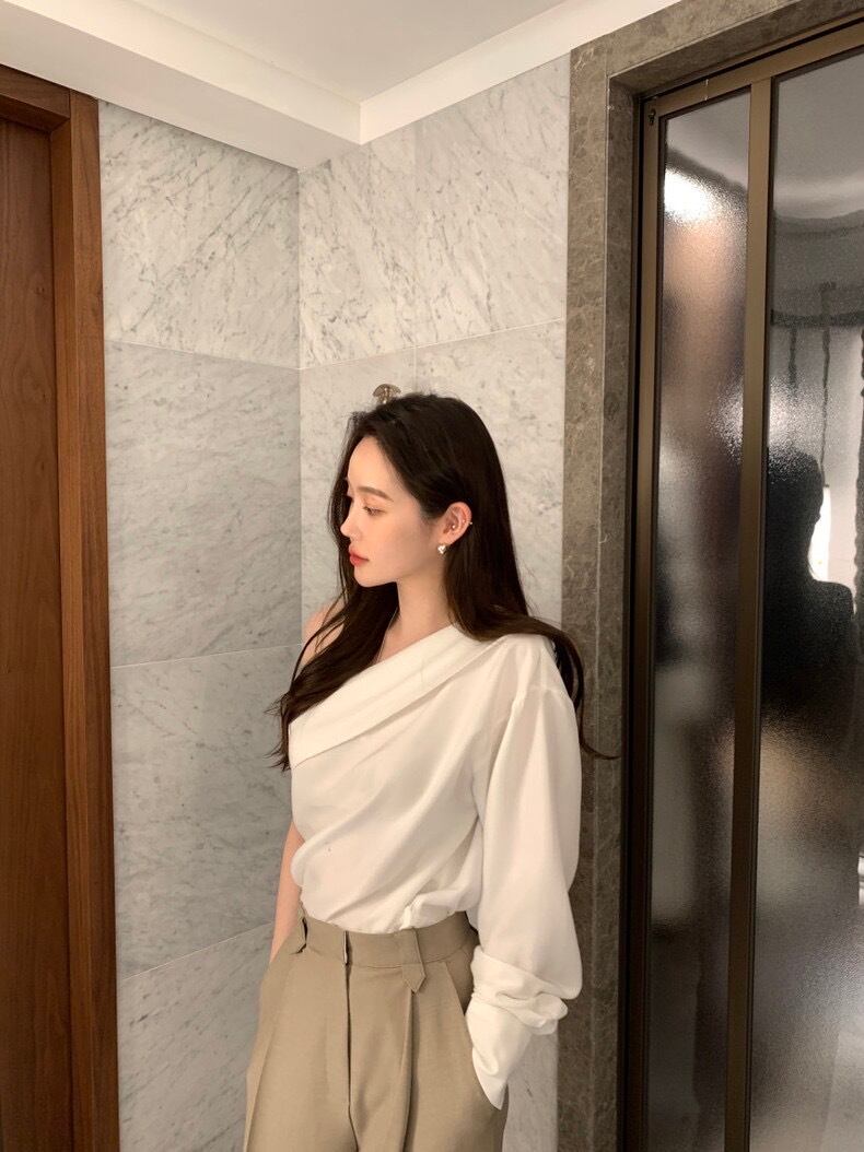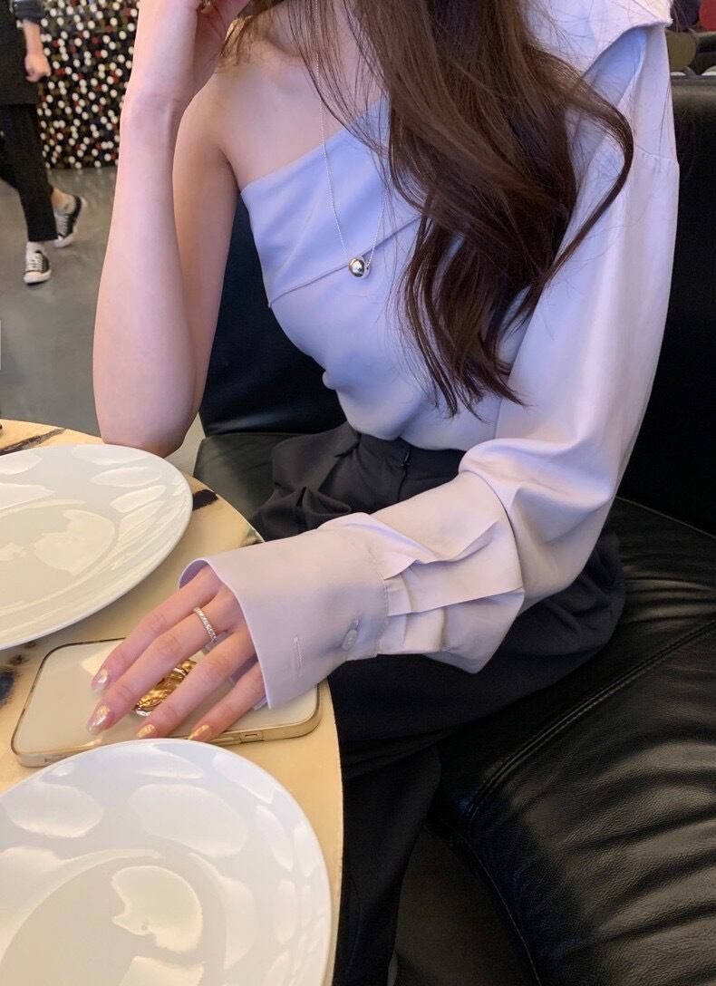 全2色シンプルシャツワンショルダートップス